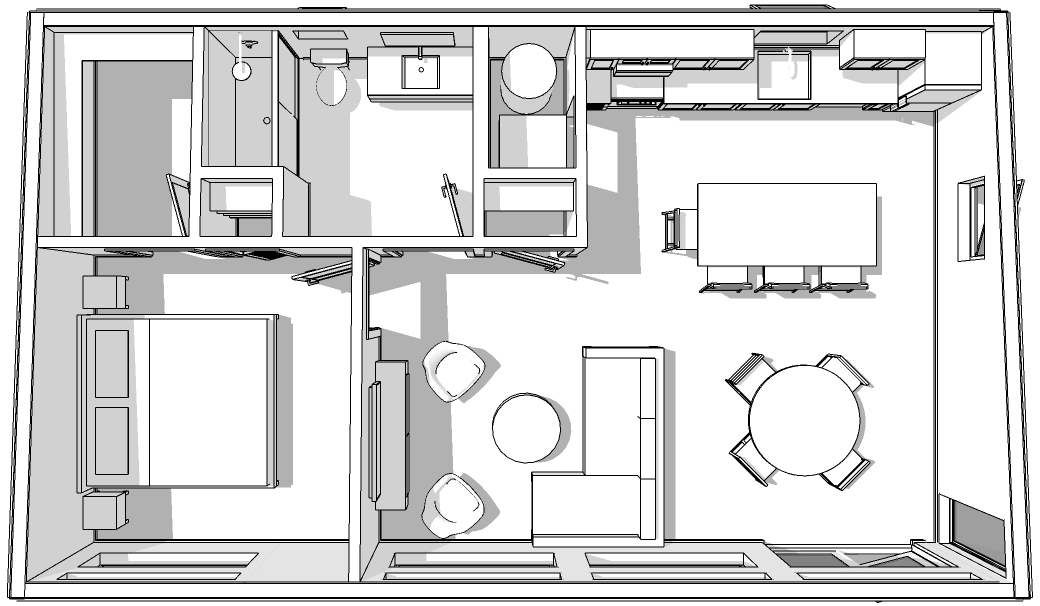 The Summit 680 is a 1-2-bedroom, 1-bathroom ADU that offers a perfect blend of comfort and convenience. With a spacious living area, a full kitchen, and a bathroom that can be configured to your liking, this home is designed to meet your needs. Whether you're looking for a guest house, a home office, or a place to live, the Summit 680 is the perfect solution.