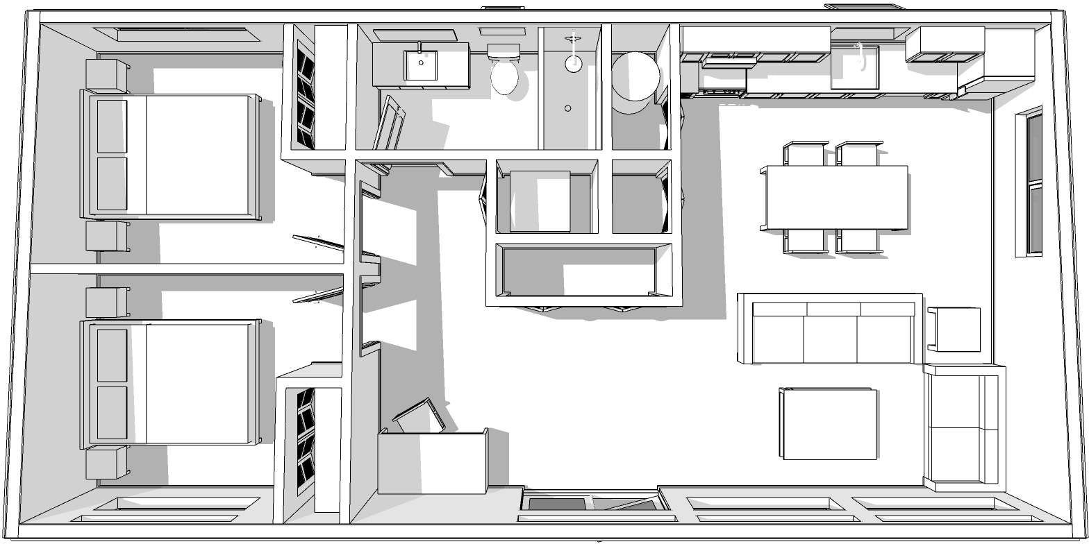 The Summit 800 is a 2-bedroom, 1-bathroom ADU that offers a perfect blend of comfort and convenience. With a spacious living area, a full kitchen, and a bathroom that can be configured to your liking, this home is designed to meet your needs. Whether you're looking for a guest house, a home office, or a place to live, the Summit 800 is the perfect solution.